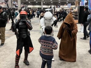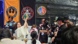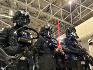 この日はフルキャラクターで臨み、写真撮影やトルーパー・ターゲット・トレーニング・スクール、ラッフル(抽選会)による募金活動、反乱軍スパイ検査スキャンステーションを備えた帝国式セキュリティチェックポイントの設置など、多彩なプログラムを実施し、コスプレパレードにも参加しました。この日はダース・ベイダーも加わり、会場に帝国の存在感を示しました。